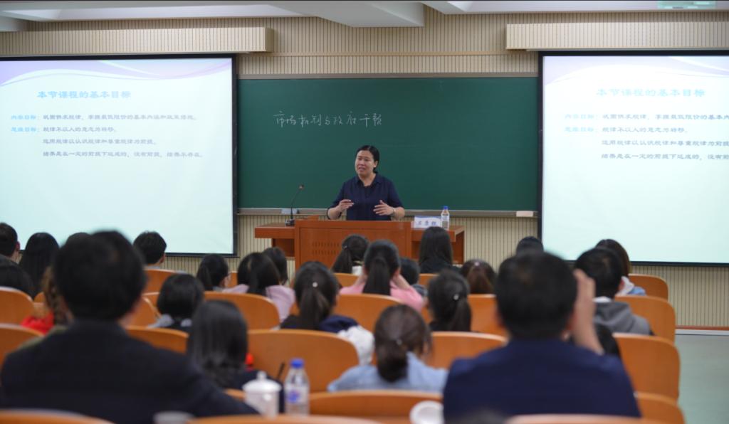 课程开始前,吕康银从课程目标、教学目标、教学方法等方面进行了“说课”。在正式授课阶段,吕康银介绍了最低限价与最高限价的含义、本质、产生原因及实施手段等。在与学生互动中,她结合时事新闻,调动学生学习的积极性,引导学生运用经济学知识理解市场机制与政府干预间的关系,培养学生理性思维。